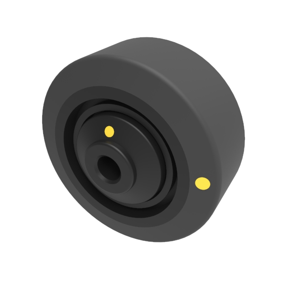 Electrically conductive 65 shore A rubber black elastic rubber tyre on a black nylon centre wheel with single ball bearing.Diameter 80mm, Tread width 35mm, bore 10mm, hub 47mm. Load capacity 150kg.Conductivity range is 10^3 ohm to 10^4 ohm
