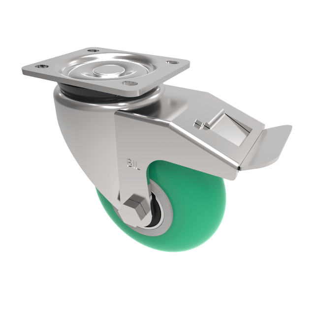 Pressed steel swivel castor with a top plate fixing fitted with a 85 shore A green ergonomic polyurethane tyred on a aluminimum centred wheel with a ball bearing and total lock brake. Wheel diameter 125mm, tread width 50mm, overall height 156mm, top plate 105mm x 86mm, hole centres 80mm x 60mm. Load capacity 450kg.