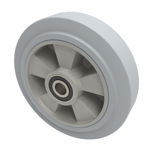Grey high elastic natural 65 shore A rubber tyre on aluminium centred wheel with a ball bearing. Diameter 200m, tread width 50mm, bore size 20mm, hub length 60mm. Load capacity 500kg at 4kph and 200kg at 10kph REACH compliant also PAH-Free rubber to confirm to EU-directive 2005/69/EC