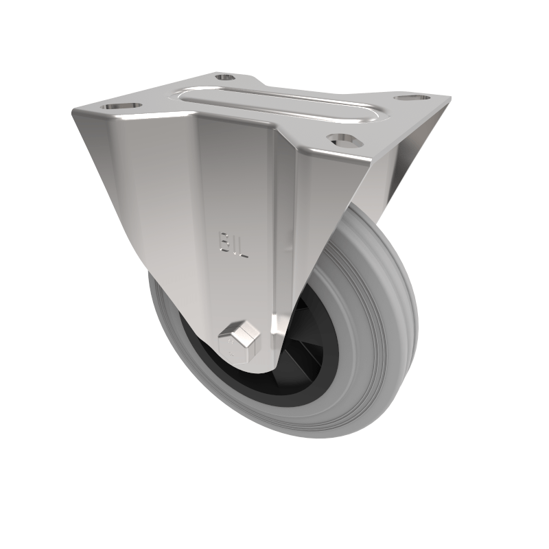 Pressed steel fixedl castor with a top plate fixing fitted with a grey rubber tyred polypropylene centred wheel with a roller bearing bore. Wheel diameter 160mm, tread width 40mm, overall height 195mm, top plate 140mm x 110mm, hole centres 105mm x 80/75mm. Load capacity 140kg.