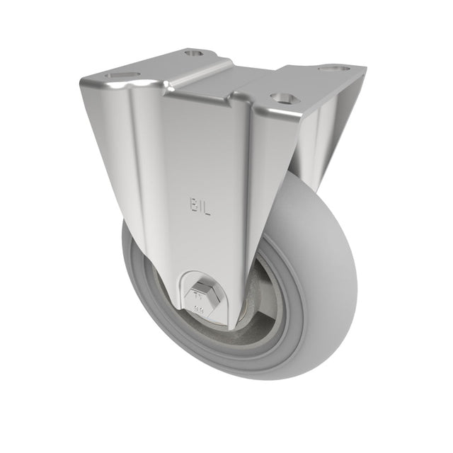 Pressed steel fixed castor with a top plate fixing fitted with grey ergonomic high elastic natural 55 shore A round profile rubber tyred aluminium centred wheel with ball bearings. Wheel diameter 150mm, tread width 50mm, overall height 190mm, top plate 105mm x 86mm, hole centres 80mm x 60mm. Load capacity 270kg. REACH compliant also PAH-Free rubber to confirm to EU-directive 2005/69/EC, also available with flat tread details on request