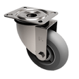 Pressed steel swivel castor with a top plate fixing with a grey ergonomic grey high elastic natural 55 shore A round profile rubber tyred wheel with a aluminium centre with a ball bearing. Wheel diameter 125mm, tread width 40mm, overall height 155mm, top plate 105mm x 86mm, hole centres 80mm x 60mm. Load capacity 200kg. REACH compliant also PAH-Free rubber to confirm to EU-directive 2005/69/EC, also available with flat tread details on request