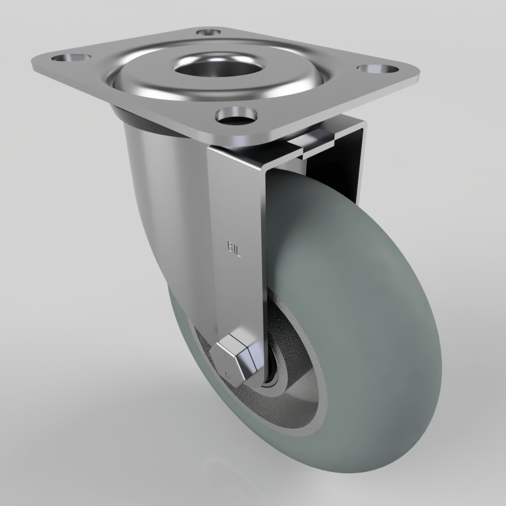 Pressed steel swivel castor with a top plate fixing with a grey ergonomic grey high elastic natural 55 shore A round profile rubber tyre wheel with an aluminium centre with ball bearings. Wheel diameter 125mm, tread width 40mm, overall height 155mm, top plate 105mm x 85mm, hole centres 80mm x 60mm. Load capacity 200kg. REACH compliant also PAH-Free rubber to confirm to EU-directive 2005/69/EC, also available with flat tread details on request