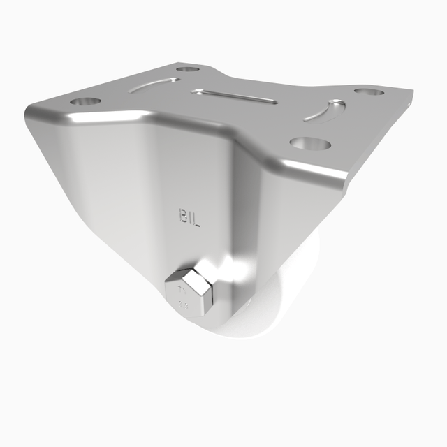 Pressed steel fixed castor with a top plate fixing fitted with a white nylon wheel with ball bearings. Wheel diameter 125mm, tread width 35mm, overall height 165mm, top plate 105mm x 86mm, hole centres 80mm x 60mm. Load capacity 500kg.