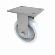 Fabricated fixed castor with a top plate fixing fitted with a white nylon wheel with ball bearings. Wheel diameter 150mm, tread width 45mm, overall height 190mm, top plate 135mm x 110mm, hole centres 105mm x 80mm. Load capacity 600kg.