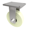 Fabricated fixed castor with a top plate fixing fitted with a white nylon wheel with ball bearings. Wheel diameter 200mm, tread width 50mm, overall height 250mm, top plate 150mm x 110mm, hole centres 105mm x 80mm or 121mm x 59mm. Load capacity 1500kg.
