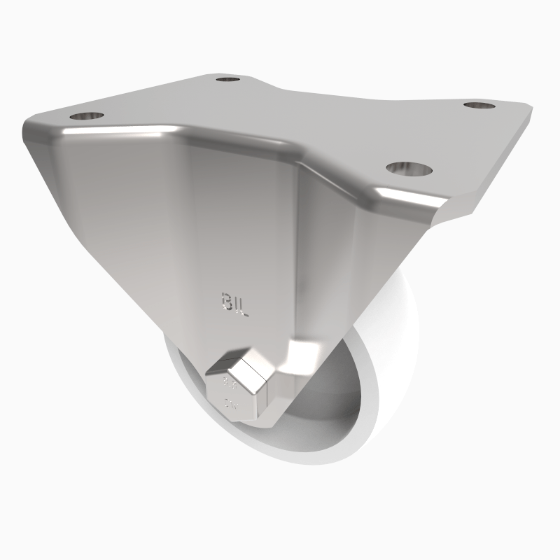 Pressed steel fixed castor with a top plate fixing fitted with a white nylon wheel with a plain bore. Wheel diameter 80mm, tread width 35mm, overall height 110mm, plate size 105mm x 86mm, hole centres 80mm x 60mm. Load capacity 250kg.