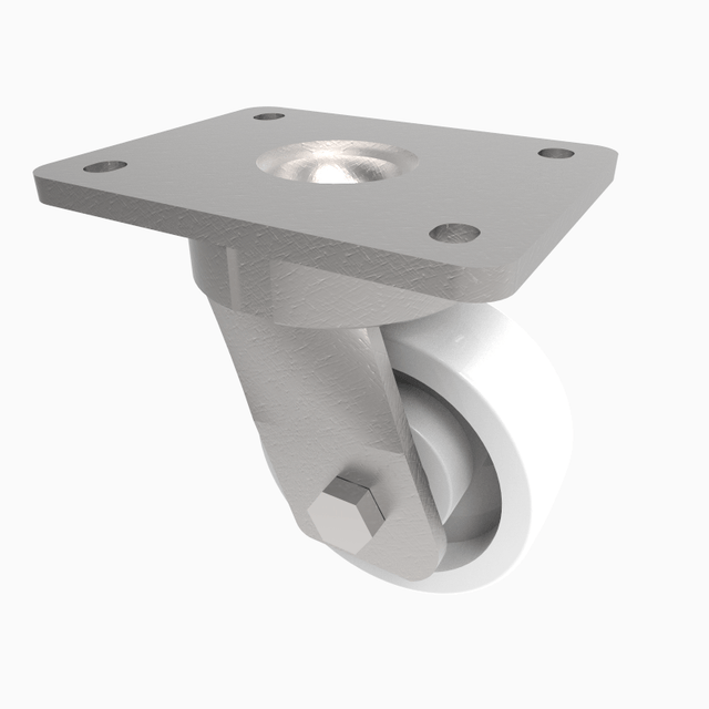 Fabricated swivel castor with a top plate fixing fitted with a white nylon wheel with ball journal bearings. Wheel diameter100mm, tread width 40mm, overall height 140mm, top plate 138mm x 110mm, hole centres 105mm x 80/75mm. Load capacity 650kg.