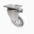 Pressed steel swivel castor with a top plate fixing fitted with a white nylon wheel with plain bore. Wheel diameter 125mm, tread width 45mm, overall height 165mm, top plate 105mm x 86mm, hole centres 80mm x 60mm. Load capacity 500kg.