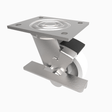 Fabricated swivel castor with a top plate fixing fitted with a white nylon wheel with ball bearings and a side fitting wheel brake. Wheel diameter 100mm, tread width 40mm, overall height 143mm, top plate 135mm x 110mm, hole centres 105mm x 80mm. Load capacity 400kg.