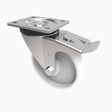 Pressed steel swivel castor with a top plate fixing fitted with a white nylon wheel with a roller bearing and total lock brake. Wheel diameter 125mm, tread width 35mm, overall height 155mm, top plate 105mm x 86mm, hole centres 80mm x 60mm. Load capacity 300kg.