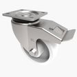 Pressed steel swivel castor with a top plate fixing fitted with a white nylon wheel with a ball bearing and a total lock brake. Wheel diameter 125mm, tread width 45mm, overall height 165mm, top plate 135mm x 110mm, hole centres 105mm x 80mm. Load capacity 500kg.