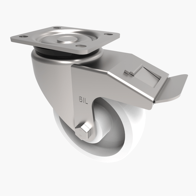 Pressed steel swivel castor with a top plate fixing fitted with a white nylon wheel with roller bearing and total lock brake. Wheel diameter 125mm, tread width 45mm, overall height 165mm, top plate 105mm x 86mm, hole centres 80mm x 60mm. Load capacity 500kg.