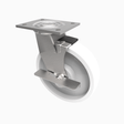 Fabricated swivel castor with a top plate fixing fitted with a white nylon wheel with ball bearings and side fitting wheel brake. Wheel diameter 200mm, tread width 50mm, overall height 240mm, top plate 135mm x 110mm, hole centres 105mm x 80mm. Load capacity 600kg.