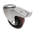 Pressed steel swivel castor with a 12mm bolt hole fitted with a brown polyurethane tyred on a cast iron centred wheel with ball bearings and total lock brake. Wheel diameter 125mm, tread width 50mm, overall height 165mm, Load capacity 400kg.
