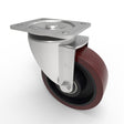 Pressed steel swivel castor with a top plate fixing fitted with a brown 94 shore A polyurethane tyre cast iron centred wheel with ball bearings. Wheel diameter 150mm, tread width 50mm, overall height 190mm, top plate 135mm x 110mm, hole centres 105mm x 80mm/75mm. Load capacity 700kg at 4kph.
