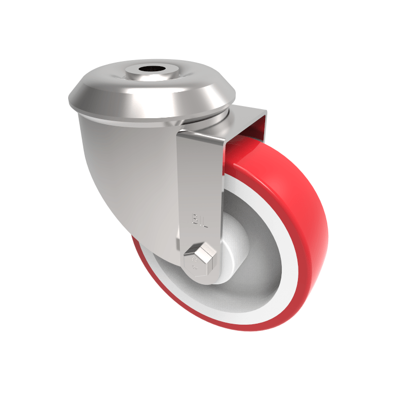 Pressed steel swivel castor with 12mm bolt hole fixing fitted with a red polyurethane white nylon centred wheel with roller bearing. Wheel diameter 100mm, tread width 30mm, overall height 128mm. Load capacity 180kg.