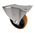 Pressed steel fixed castor with a top plate fixing fitted with a brown polyurethane on black nylon centred wheel with roller bearings. Wheel diameter 125mm, tread width 45mm, overall height 155mm, top plate 135mm x 110mm, hole centres 105mm x 80mm. Load capacity 400kg.