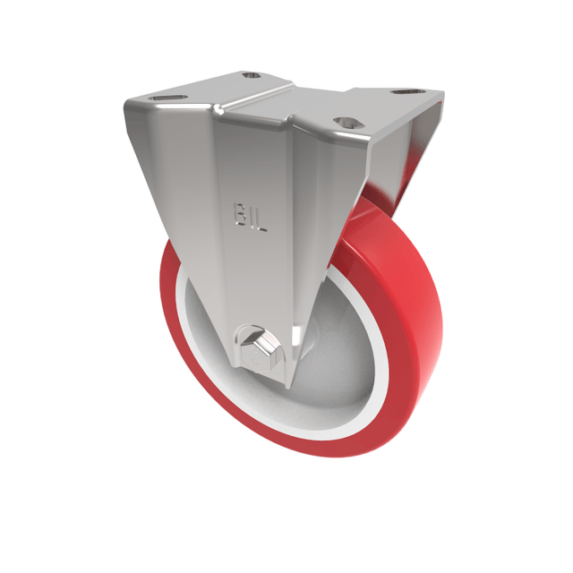 PPressed steel fixed castor with a top plate fixing fitted with a red polyurethane tyre white nylon centred wheel with plain bore. Wheel diameter 150mm, tread width 40mm, overall height 190mm, top plate 105mm x 92mm, hole centres 80mm x 60mm. Load capacity 350Kg.