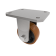 Fabricated fixed castor with a top plate fixing fitted with a brown polyurethane tyre nylon centred wheel with roller bearings. Wheel diameter 150mm, tread width 50mm, overall height 195mm, top plate 138mm x 110mm, hole centres 105mm x 80/75mm. Load capacity 600kg.