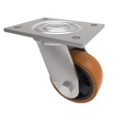 Fabricated swivel castor with a top plate fixing fitted with a brown polyurethane tyred black nylon centred wheel with ball bearings. Wheel diameter 100mm, tread width 40mm, overall height 143mm, top plate 135mm x 110mm, hole centres 105mm x 80mm. Load capacity 300kg.