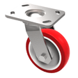 Fabricated swivel castor with a top plate fixing fitted with a red polyurethane tyred nylon centred wheel with ball bearings, Wheel diameter 150mm, tread width 50mm, overall height 200mm, top plate 150mm x 110mm, hole centres 105mm x 80mm or 121mm x 59mm. Load capacity 500kg.