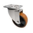 Pressed steel swivel castor with a flat plate fixing fitted with a brown polyurethane tyred on black nylon centred wheel with ball bearings. Wheel diameter 150mm, tread width 50mm, overall height 200mm, plate size 135mm x 110mm, hole centres 105mm x 80/75mm. Load capacity 600kg.