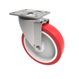 Pressed steel swivel castor with a top plate fixing fitted with a red polyurethane tyred white nylon centred wheel with roller bearings. Wheel diameter 200mm, tread width 48mm, overall height 238mm, top plate 135mm x 110mm, hole centres 105mm x 80/75mm. Load capacity 500kg.