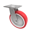 Fabricated swivel castor with a top plate fixing fitted with a red polyurethane on white nylon wheel with a plain bearing. Wheel diameter 200mm, tread width 48mm, overall height 240mm, top plate 135mm x 110mm, hole centres 105mm x 80mm. Load capacity 600kg.
