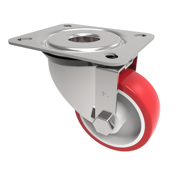 Pressed steel swivel castor with top plate fixing fitted with red polyurethane tyre on white nylon centred wheel with Plain Bore. Wheel diameter 80mm, tread width 30mm, overall height 100mm, top plate 122mm x 78mm, hole centres 80mm / 72mm or x 60mm / 52mm. Load capacity 150kg.