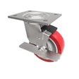 Fabricated swivel castor with a flat plate fixing fitted with a red polyurethane tyre on white nylon centred wheel with ball bearings and side fitting wheel brake. Wheel diameter 125mm, tread width 40mm, overall height 165mm, plate size 135mm x 110mm, hole centres 105mm x 80mm. Load capacity 350kg.NB due to the fact these are reinforced nylon the white centre is slightly off white.