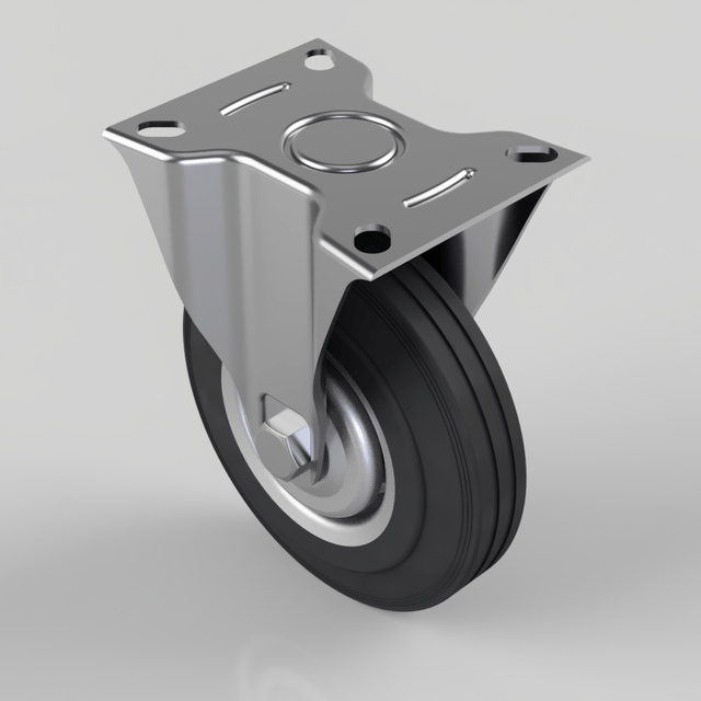 Pressed steel fixed castor with a top plate fixing fitted with black rubber tyre on pressed steel centred wheel with a roller bearing bore. Wheel diameter 125mm, tread width 33mm, overall height 153mm, top plate 102mm x 85mm, hole centres 80mm x 60mm. Load capacity 100kg.