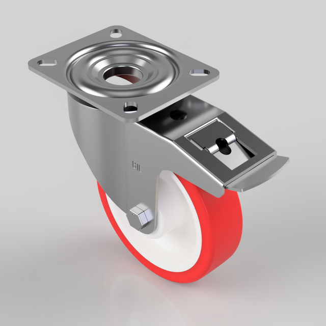 Pressed steel swivel castor with a top plate fixing fitted with a red polyurethane white nylon centred wheel with a roller bearing and total lock brake. Wheel diameter 150mm, tread width 40mm, overall height 190mm, top plate 135mm x 110mm, hole centres 105mm x 80mm. Load capacity 350kg.