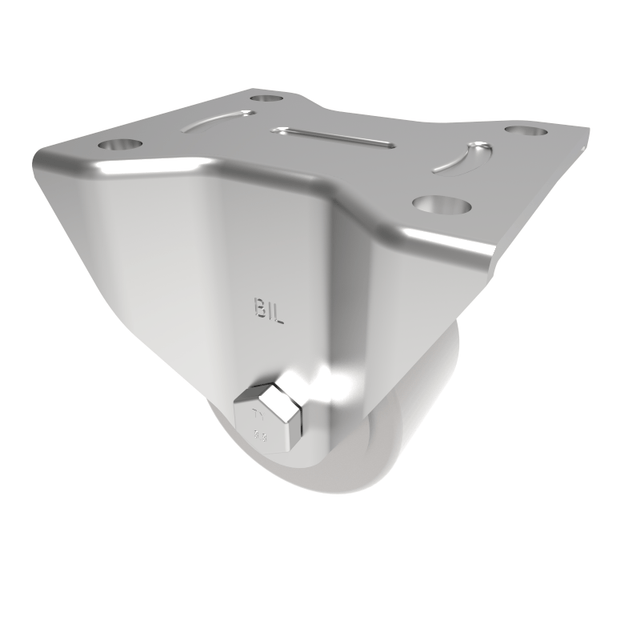 Pressed steel fixed castor with a top plate fixing fitted with a solid machined steel wheel with ball bearings. Wheel diameter 100mm, tread width 40mm, overall height 140mm, top plate 105mm x 86mm, hole centres 80mm x 60mm. Load capacity 800kg ** SPECIAL MANUFACTURE 4-6 WEEKS DELIVERY **