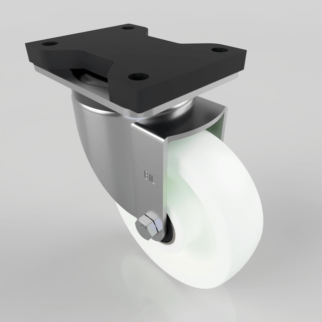 Pressed steel swivel castor with a top plate fixing fitted with a white nylon wheel with ball bearings. Wheel diameter 150mm, tread width 45mm, overall height 204mm, top plate 135mm x 110mm, hole centres 105mm x 80mm Load capacity 700kg.