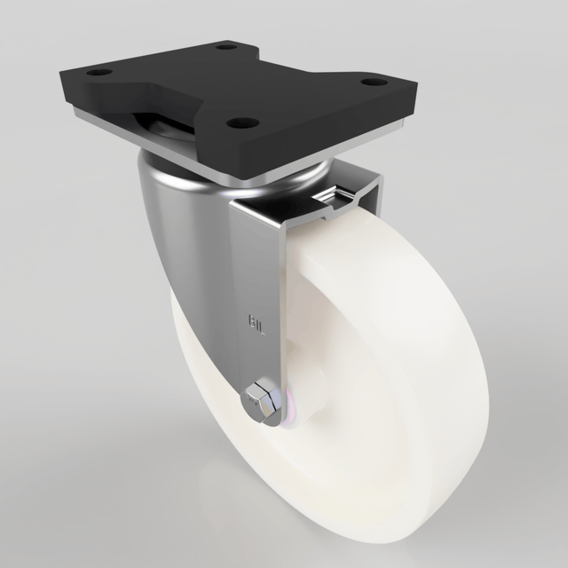 Pressed steel swivel castor with a top plate fixing fitted with a white nylon wheel with roller bearings. Wheel diameter 200mm, tread width 50mm, overall height 248mm, top plate 135mm x 110mm, hole centres 105mm x 80mm Load capacity 700kg.