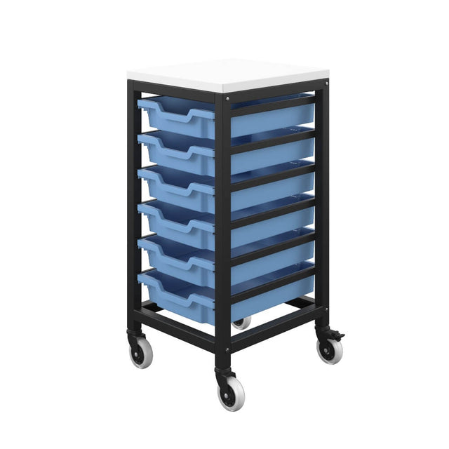 Mobile Tray Storage, available with Small, Medium or Large trays. The mobile tray trolleys come with a black frame and a white top and 4 swivel castors. Perfect for use in schools and offices.