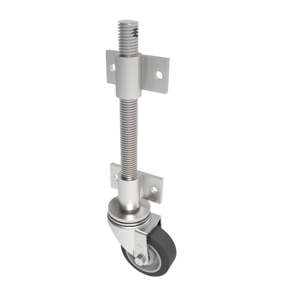 Open screw thread jacking castor with side fitting nuts with 160mm lift fitted with a 125mm white zinc plated swivel pressed steel castor fitted with a black high elastic natural 65 shore A rubber tyred aluminium wheel land ball bearings load capacity of 200kg Please note Jacking castors are rated on a different principal to other castors and we recommend the total lifted load is divided over just 2 jacking units.1 extra safety point is when jacked up please beware of any obstacles as a sudden shock could result in bending the thread but more likely the castor will tear away from the screw thread. Please refer to the BIL catalogue or request a drawing