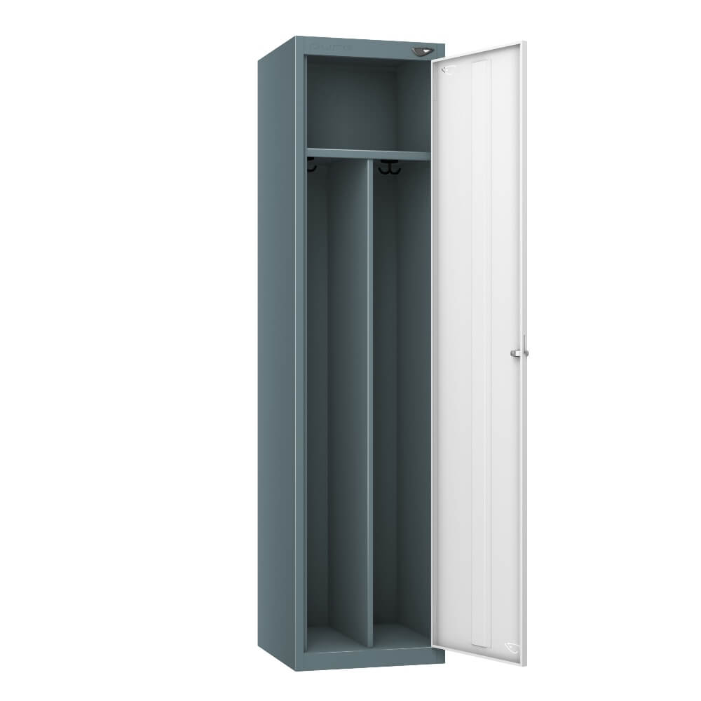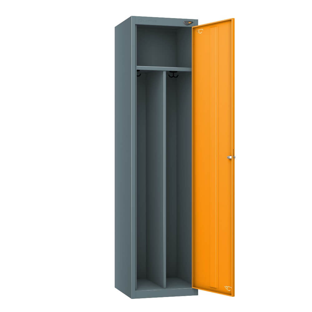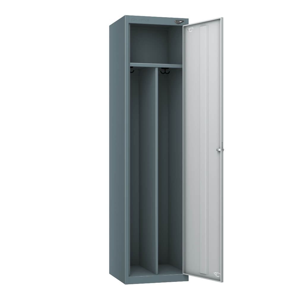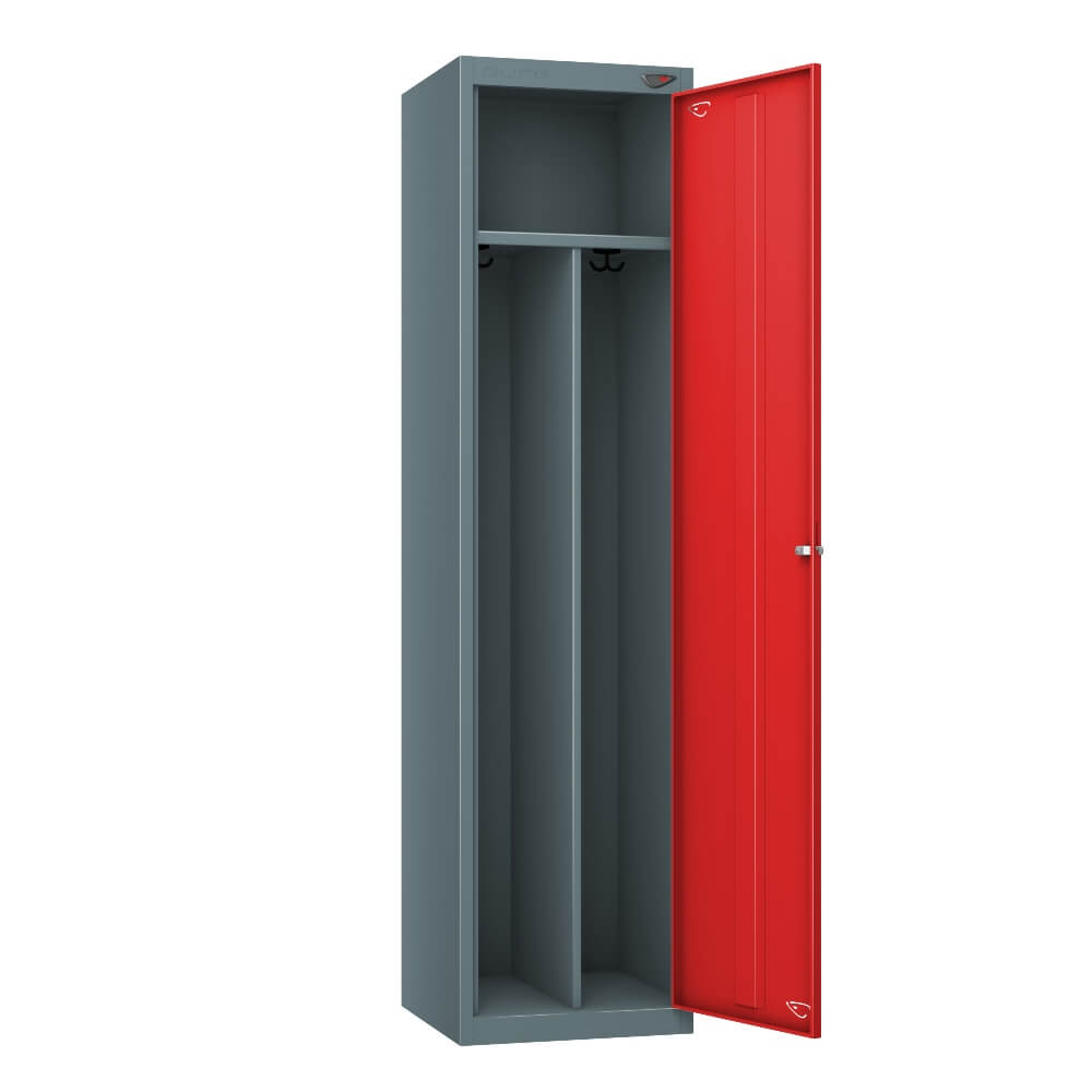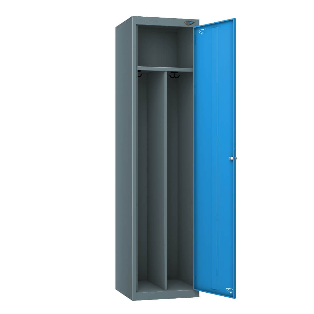 These durable steel lockers, featuring a robust steel body and door, are perfect for workplaces where staff need to keep workwear separate from personal clothing. Each locker includes a partition behind the single door, with a top shelf for storage and two separate hanging compartments, each equipped with a coat hook.