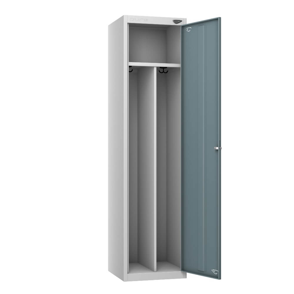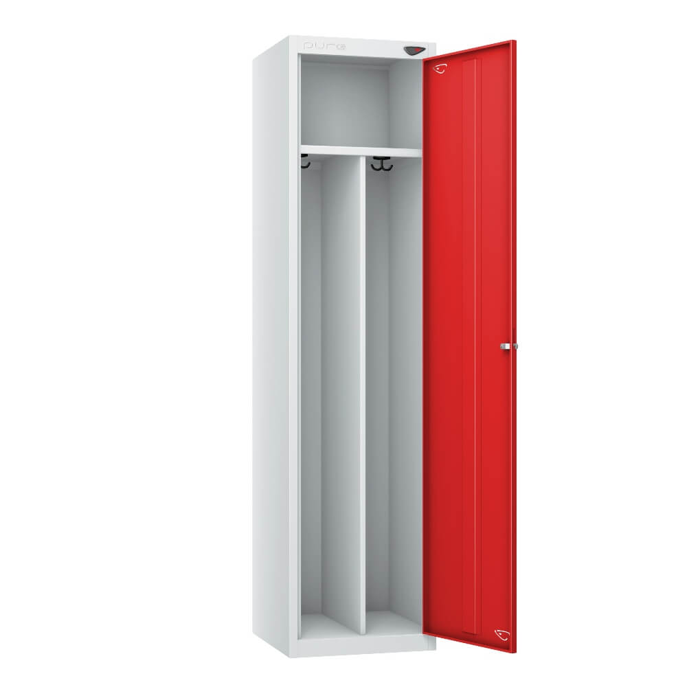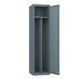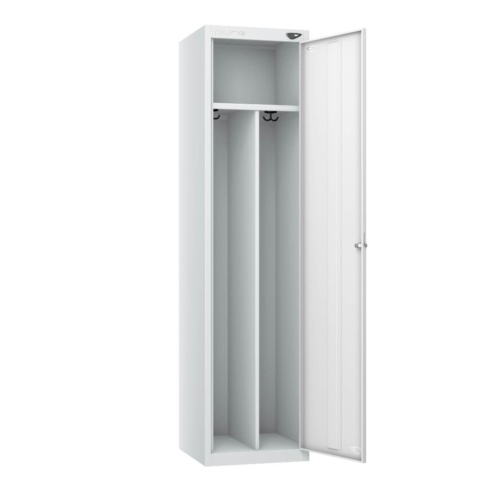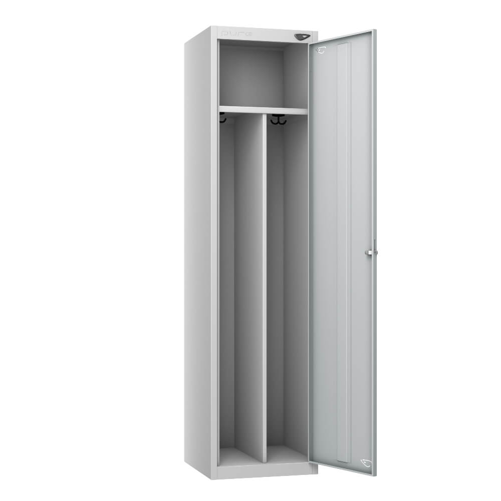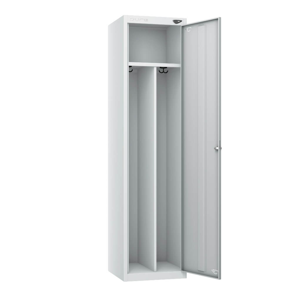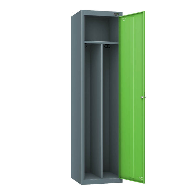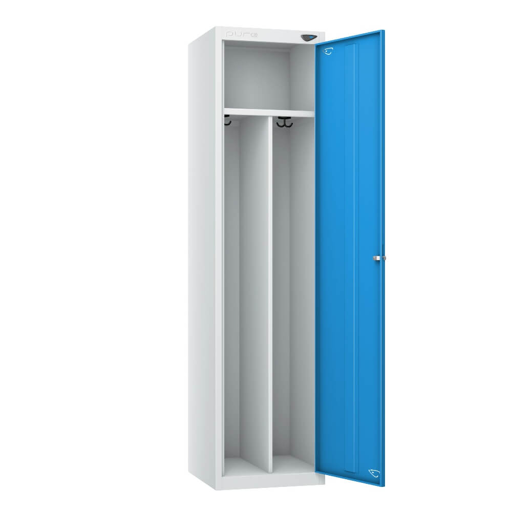 These durable steel lockers, featuring a robust steel body and door, are perfect for workplaces where staff need to keep workwear separate from personal clothing. Each locker includes a partition behind the single door, with a top shelf for storage and two separate hanging compartments, each equipped with a coat hook.