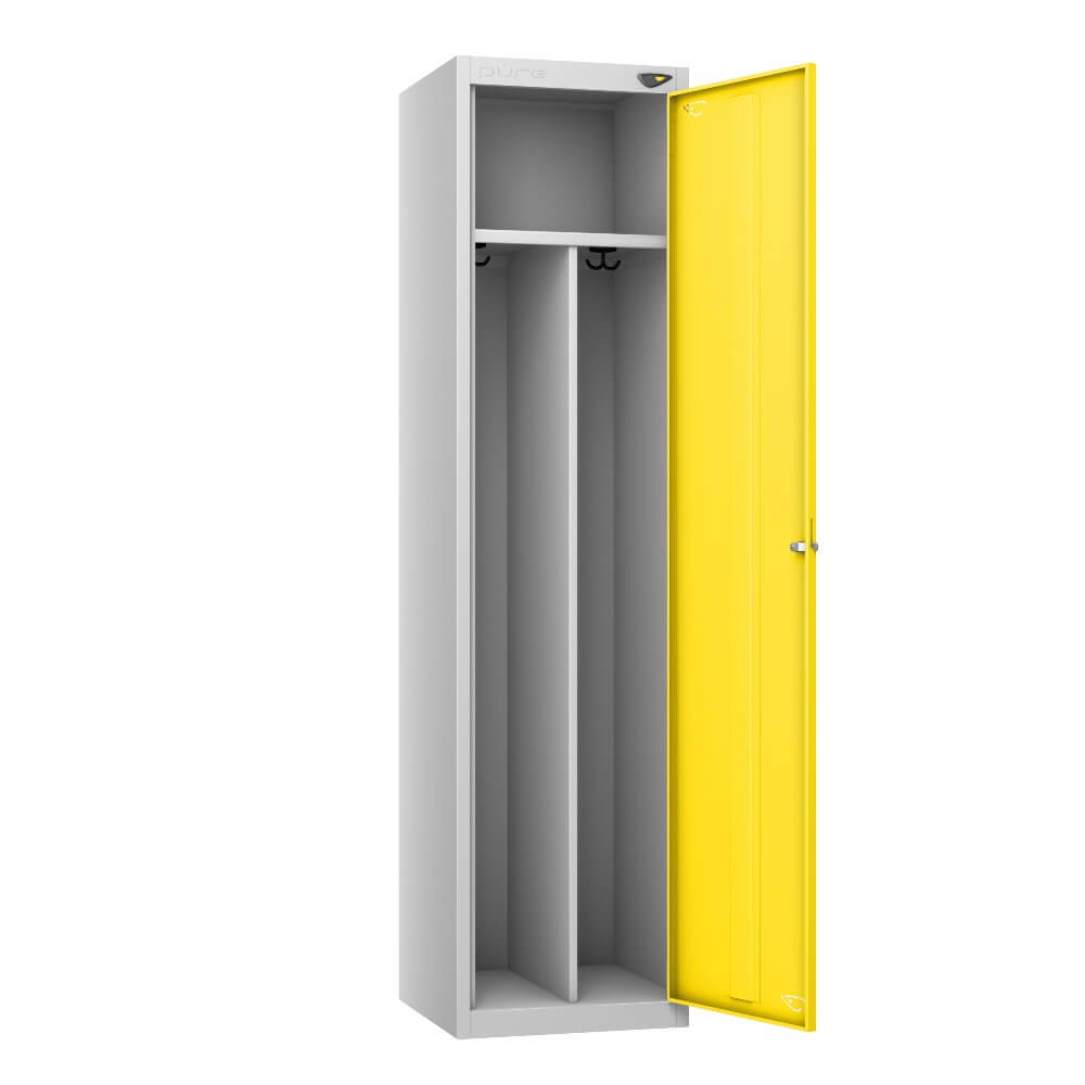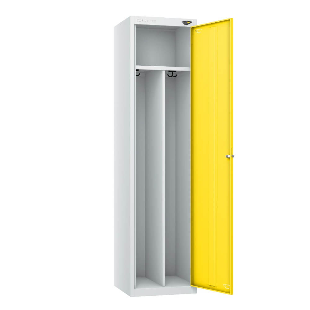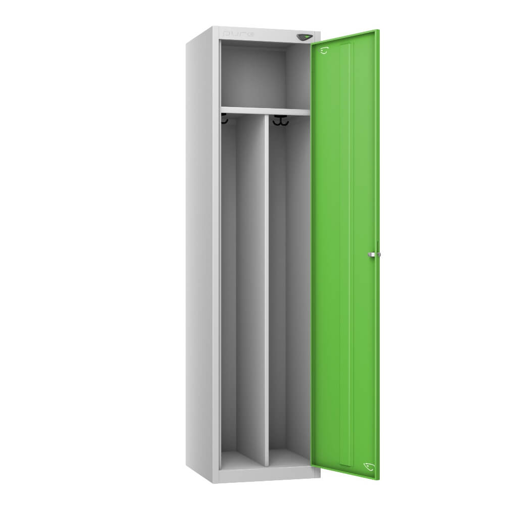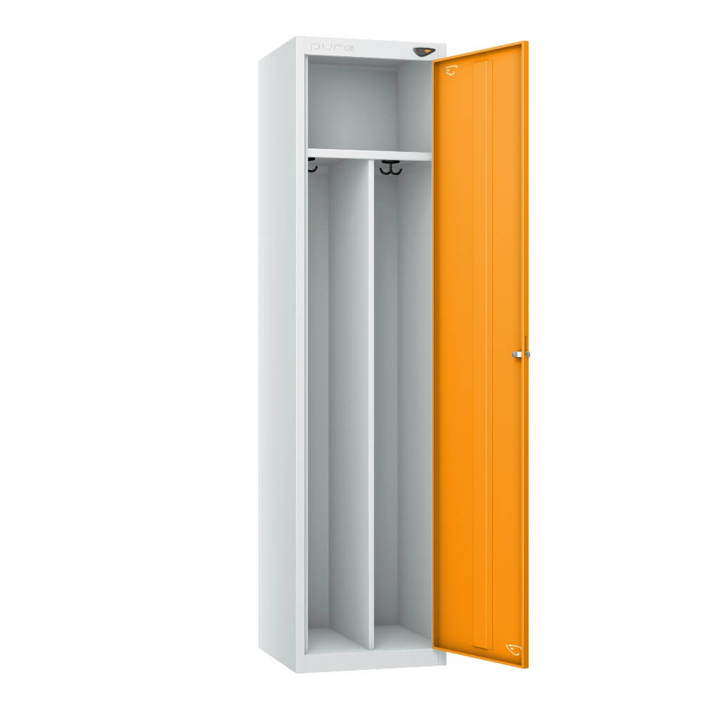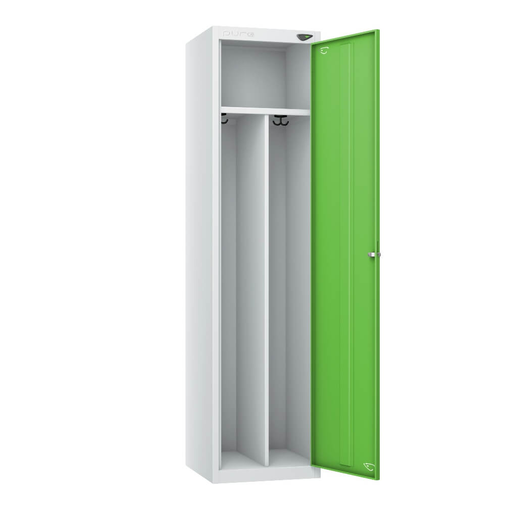 These durable steel lockers, featuring a robust steel body and door, are perfect for workplaces where staff need to keep workwear separate from personal clothing. Each locker includes a partition behind the single door, with a top shelf for storage and two separate hanging compartments, each equipped with a coat hook.