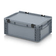 These solid Euro stacking containers feature an integral, hinged lid and a modular design for efficient storage and handling.