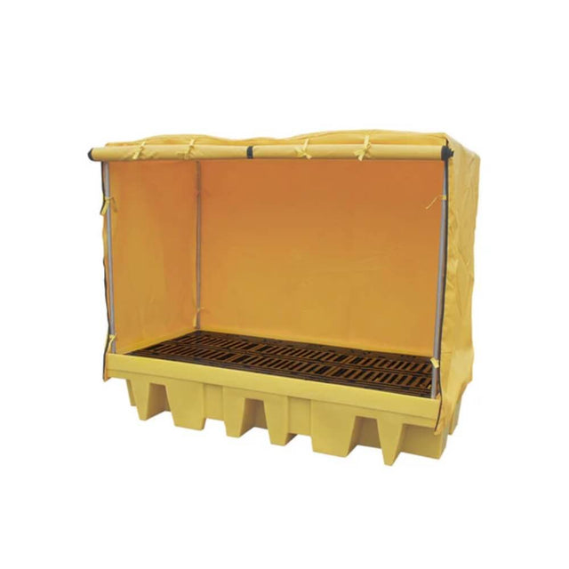 Designed to give you the flexibility of using a poly IBC spill pallet outdoors without the sump filling with rainwater this IBC spill pallet comes complete with a self-assembly steel frame and polyethylene cover. The opening flap of the cover has ties to hold it in place when rolled open.