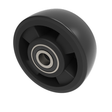 Black polyurethane tyred nylon centred ball bearing. Wheel diameter 125mm, tread width 45mm, bore size 20mm, hub length 49mm. Load capacity 400kg.