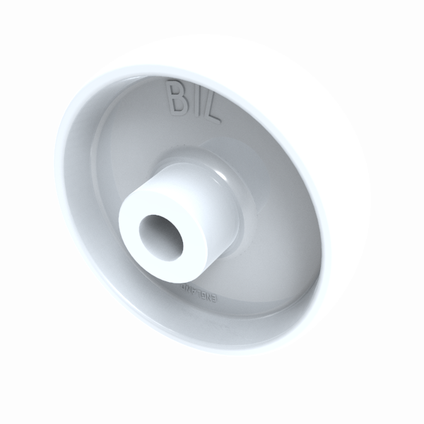White nylon wheel with a plain bore. Wheel diameter 100mm, tread width 32mm, bore size 15mm, hub length 48mm. Load capacity 270kg.