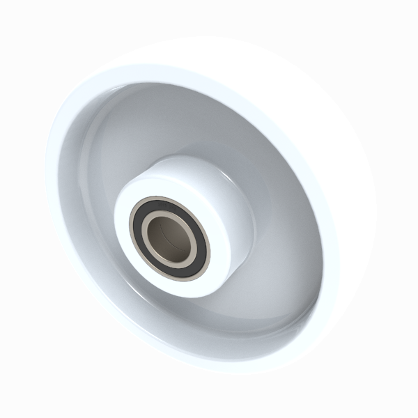 White nylon wheel fitted with ball journal bearings, 175mm wheel diameter, 50mm tread width, 25.4mm bore, 60mm hub length, 560kgs load capacity. (Catalogue SKU BZH175WNYBJM25.4)