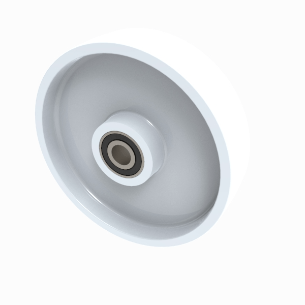 White nylon wheel with ball bearings. Wheel diameter 200mm, tread width 50mm, bore size 20mm, hub length 50mm. Load capacity 650kg.