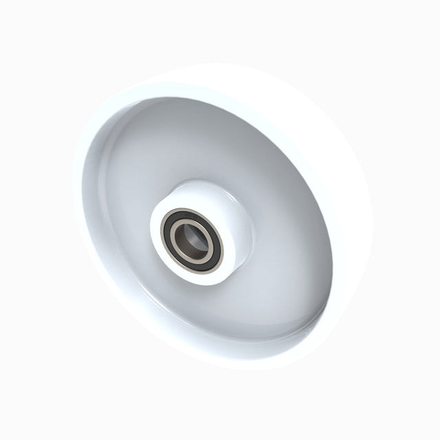 Diameter 200mm, tread width 50mm, white nylon wheel with ball bearing. Bore size 25mm, hub length 50mm, Load capacity 650kg.