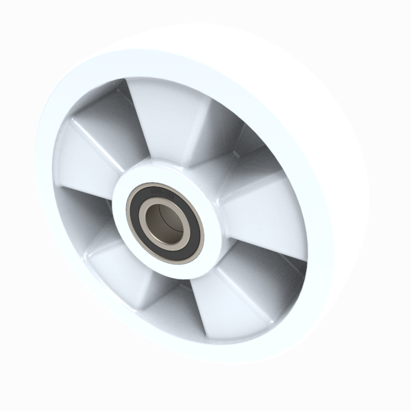 White nylon wheel with ball bearings. Wheel diameter 200mm, tread width 57mm, hub length 60mm, bore 25.4mm. Load capacity 800kg.