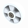 White nylon wheel with ball bearings. Wheel diameter 200mm, tread width 57mm, hub length 60mm, bore 25mm. Load capacity 800kg.